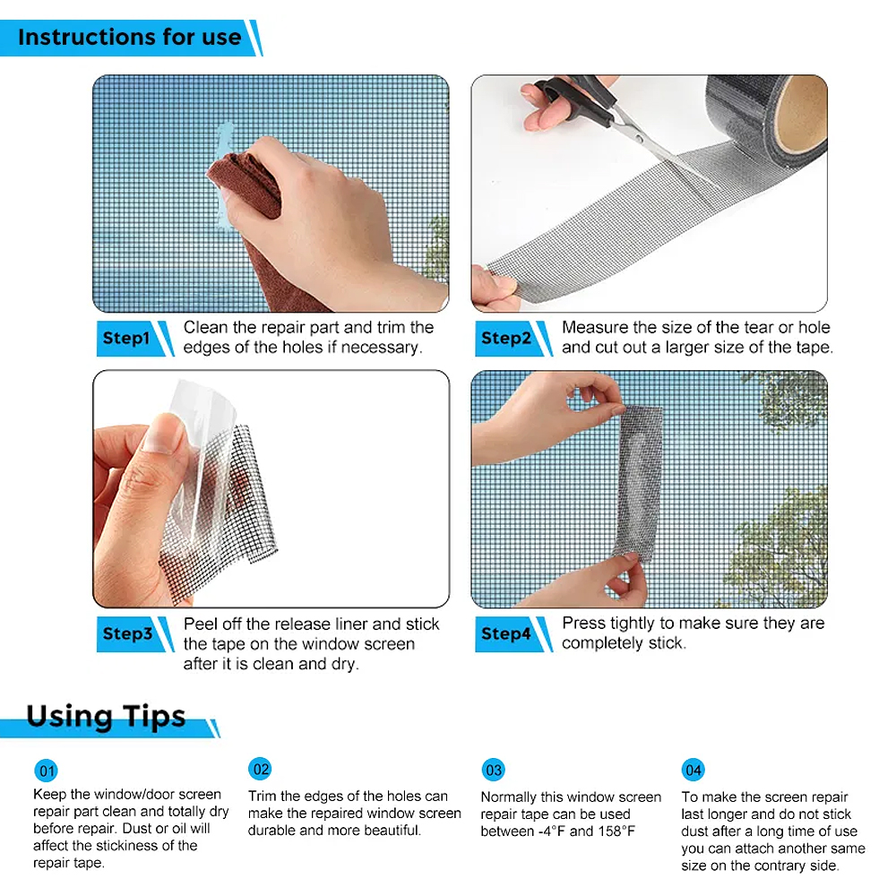 Quick Repair Tape:An excellent DIY solution that effectively fixes every rip and tear on your window and door screens in a sec! Simply peel, cut your desired length, stick it to the damage area and done. Allowing you to patch small to largest size damage screens easily and reject insects and mosquitoes from invading.
