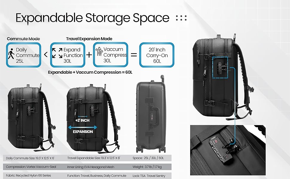 Expandable Capacity: With a generous 60L capacity when compressed, this backpack offers the storage equivalent of a carry on rolling suitcase, but with a compact size of just 40L travel backpack airpack. Perfect for those who need to carry more without the bulk.
